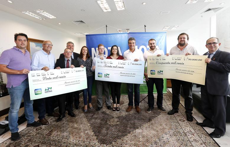 Um engenheiro de Maringá, uma professora de Ponta Grossa e uma instituição sem fins lucrativos de Curitiba levaram os três principais prêmios do primeiro sorteio do ano do programa Nota Paraná. Os prêmios de R$ 50 mil, R$ 30 mil e R$ 20 mil foram entregues pelo governador Beto Richa nesta quarta-feira (17), em evento no Palácio Iguaçu, em Curitiba.