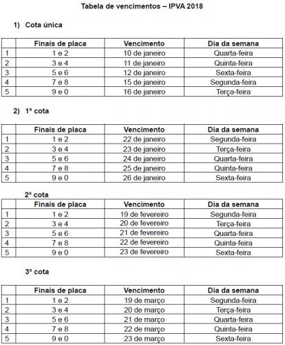 O pagamento do IPVA 2018 começa no dia 10 de janeiro e o Estado concederá desconto de 3% aos contribuintes que optarem pela quitação em parcela única, conforme calendário por final da placa (ver tabela).