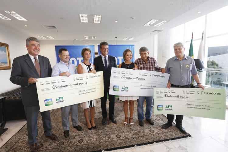 Os ganhadores dos três maiores prêmios do 28ª sorteio do Programa Nota Paraná receberam os cheques com os valores de R$ 50 mil, R$ 30 mil e R$ 20 mil das mãos do governador Beto Richa durante cerimônia realizada na tarde desta terça-feira (13) no Palácio Iguaçu, em Curitiba. O Provopar Estadual (Programa do Voluntariado Paranaense) foi um dos contemplados neste sorteio de março, recebendo o segundo maior prêmio. O de maior valor saiu para Rodrigo Cruz dos Santos, delegado da Polícia Civil do Paraná, de Pinhão (Centro-Sul), e o terceiro maior montante foi para o administrador de empresas Rubens Bittencourt, de São José dos Pinhais (RMC).