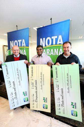 Os três maiores prêmios do oitavo concurso do programa Nota Paraná, do Governo do Estado, saíram para contribuintes de Piraquara, Curitiba e Santa Helena. Os prêmios de R$ 50 mil, R$ 30 mil e R$ 20 mil foram entregues pelo governador Beto Richa nesta terça-feira (19) no Palácio Iguaçu. O encontro teve a presença de representantes de instituições sem fins lucrativos, que participaram pela primeira vez do sorteio do Nota Paraná.